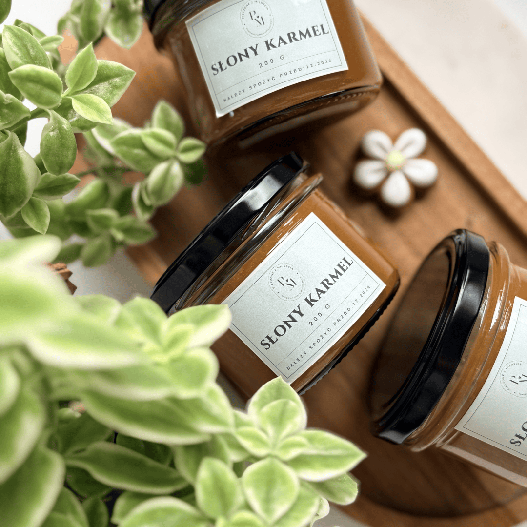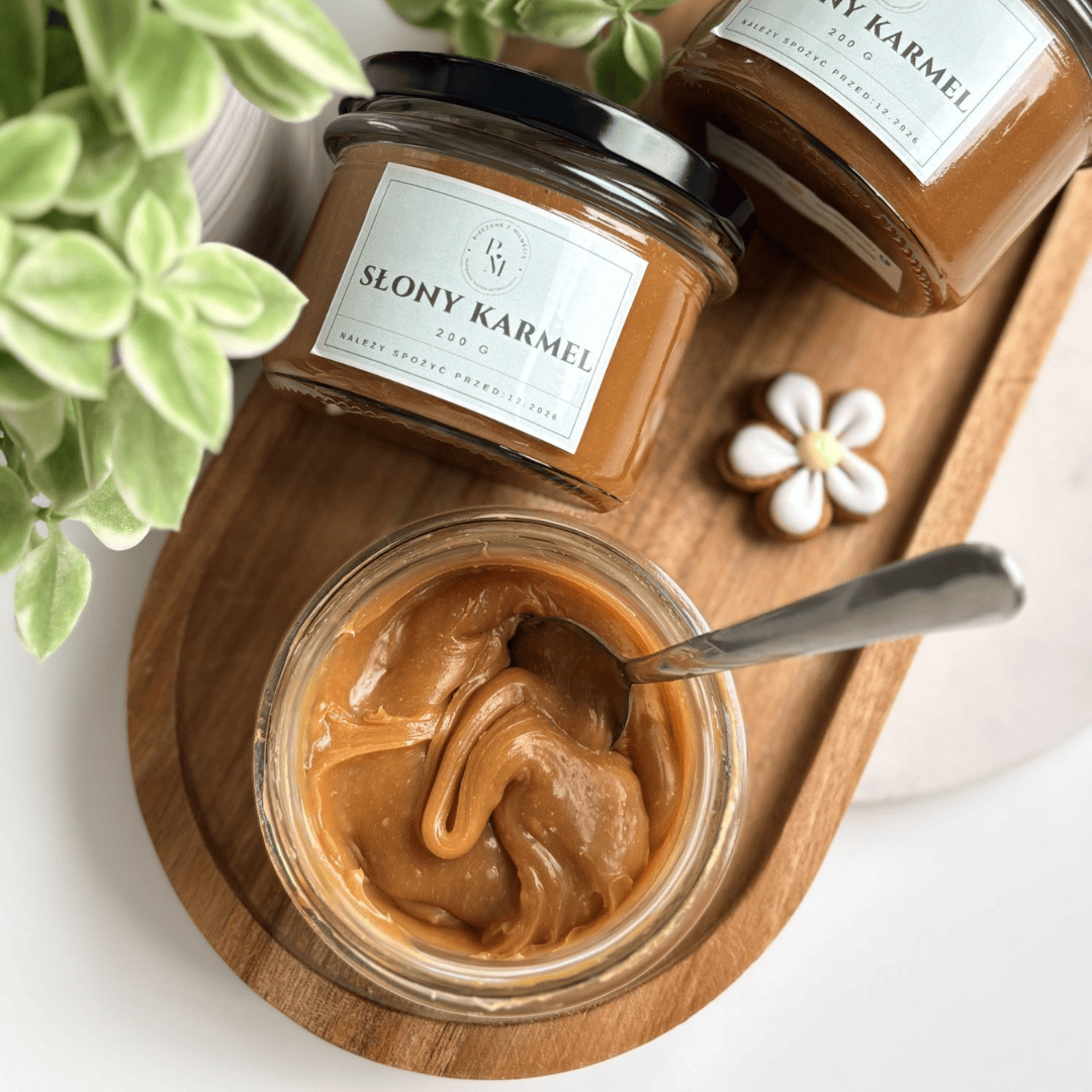 Słony karmel z pracowni Pieczone z Miłością to klasyczny, rzemieślniczy karmel przygotowywany z prostych, wysokiej jakości składników. Ma gęstą, kremową konsystencję oraz wyraźnie maślany smak przełamany dodatkiem soli.