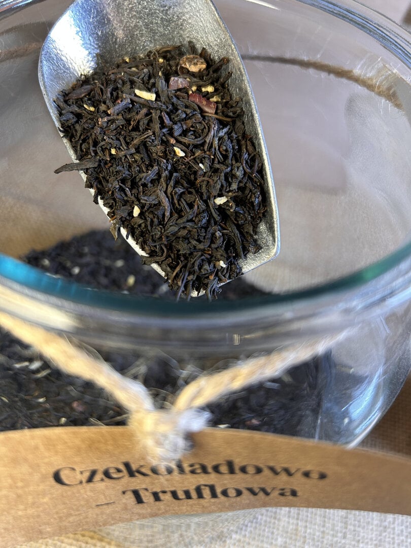 Odkryj herbatę Czekoladowo – Truflowa, gdzie intensywna czarna herbata (91%) spotyka się z kruszonymi ziarnami kakaowca, kremowymi wiórkami kokosowymi, rozpuszczającymi się kawałkami czekolady, tworząc niezwykłe doświadczenie smakowe. Każdy napar to podróż do zmysłowego świata czekoladowych trufli, gdzie aromatyczna herbata łączy się z intensywnością czekoladowych smaków. Ta luksusowa mieszanka nie tylko zadowoli Twoje podniebienie, ale także dostarczy chwil relaksu i bogactwa smaków. Poznaj Czekoladowo – Truflową herbatę – doskonałą propozycję dla miłośników czekolady i intensywnych herbat.