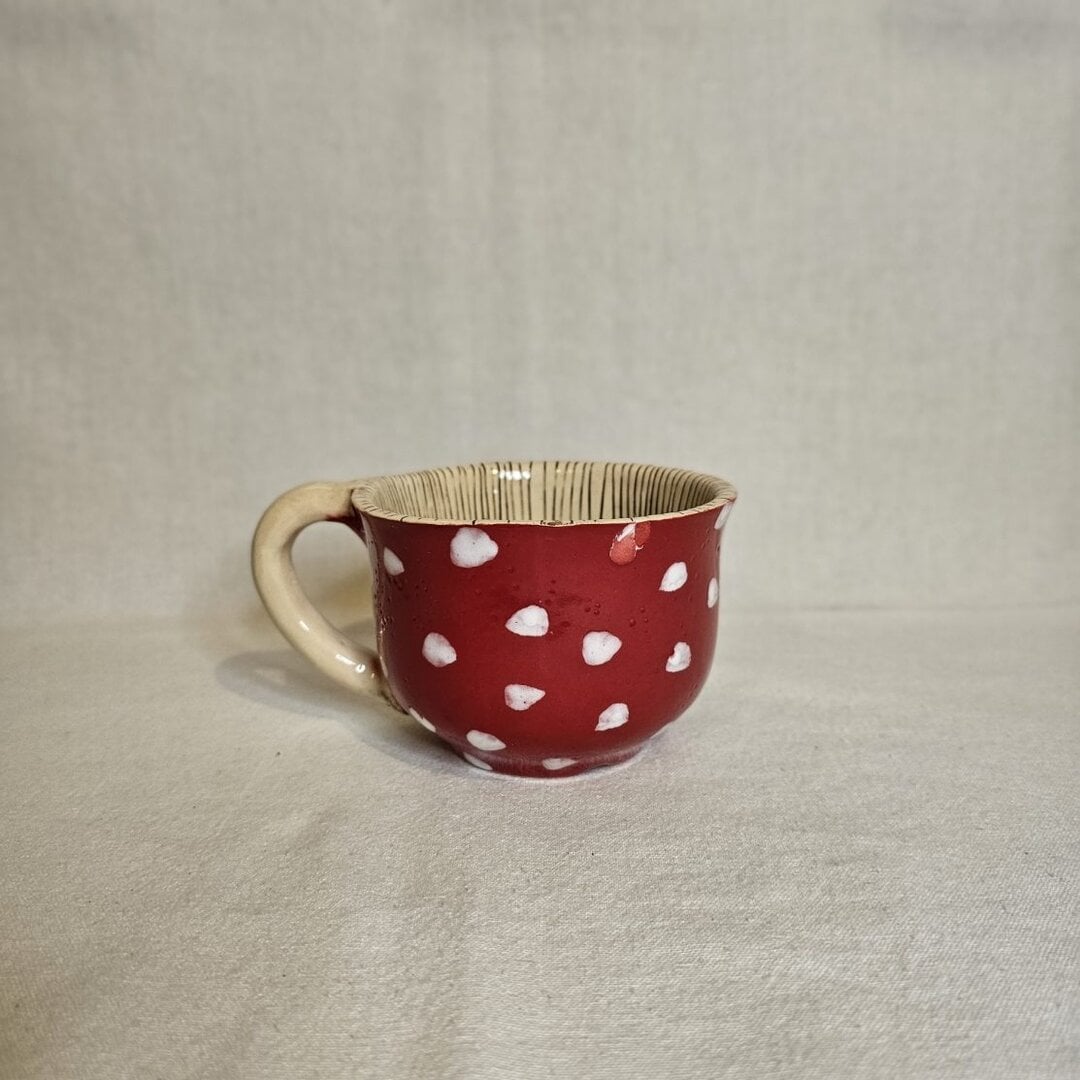 Ręcznie wykonany kubek z pracowni Taraka to ceramika, która od razu przyciąga wzrok. Czerwone szkliwo w białe kropki przywodzi na myśl muchomora z leśnej polany, a delikatny rysunek wewnątrz kubka nadaje mu charakterystyczny, rękodzielniczy styl.
