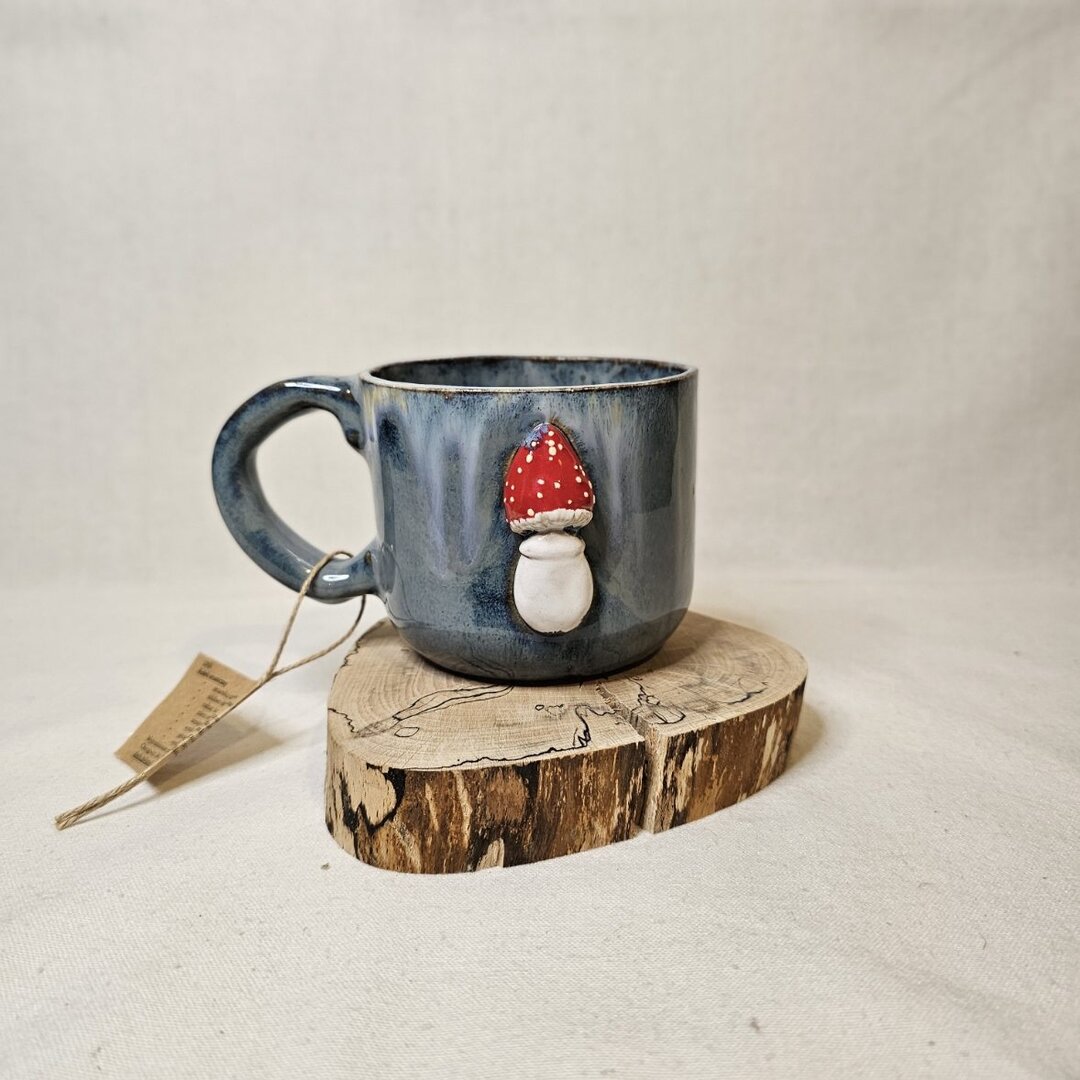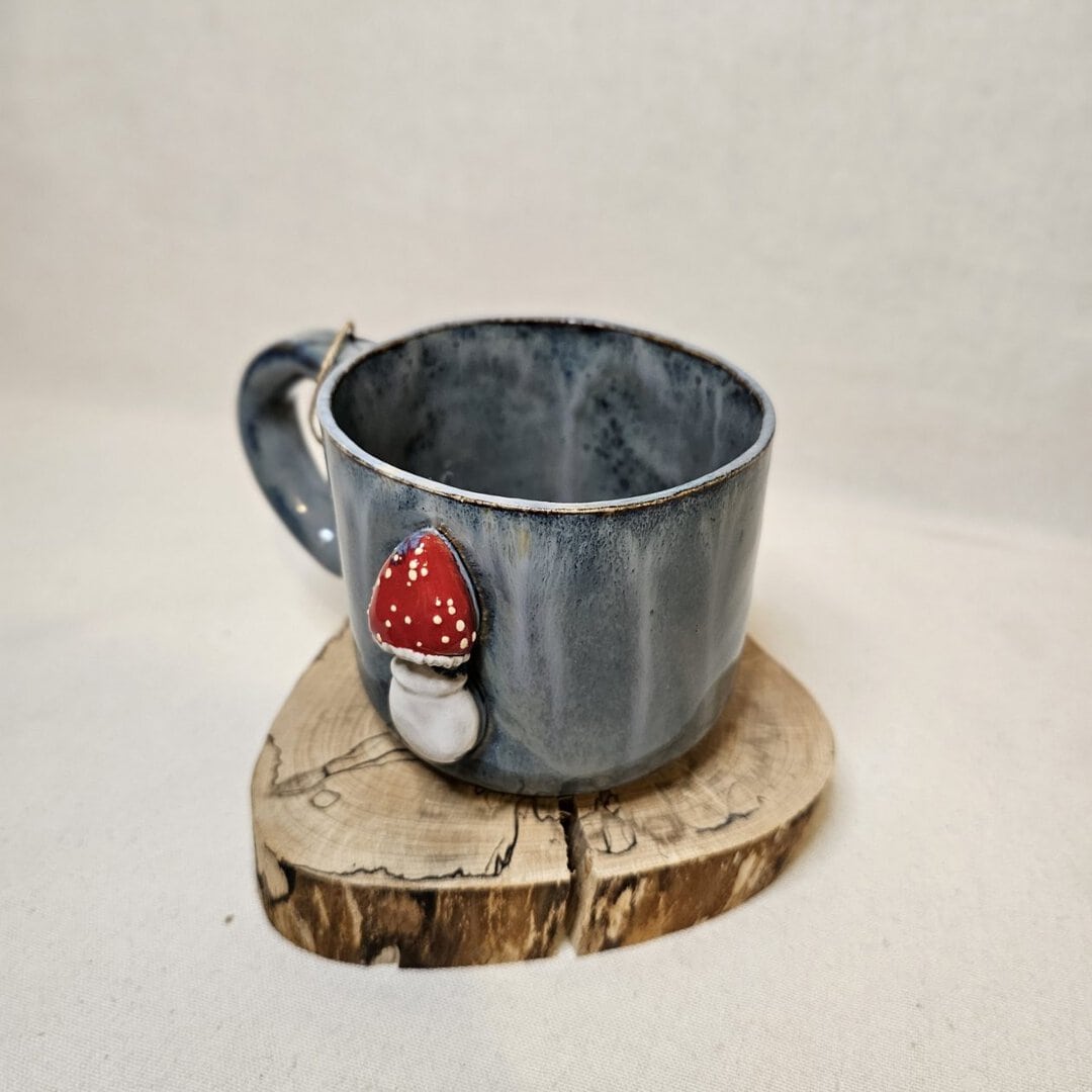 Ręcznie wykonany kubek ceramiczny z pracowni Diada, ozdobiony przestrzennym motywem czerwonego muchomora. Prosta, lekko pękata forma i głębokie, niebiesko-szare szkliwo nadają mu spokojny, naturalny charakter.