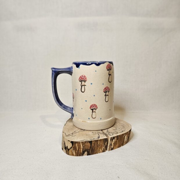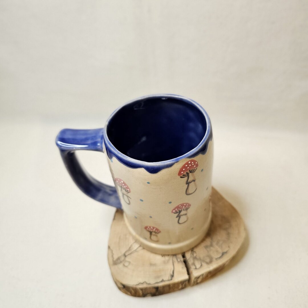 Uroczy, ręcznie wykonany kufel ceramiczny ozdobiony delikatnym wzorem muchomorków. Jasna, naturalna ceramika w połączeniu z głębokim niebieskim szkliwem wewnątrz i na uchwycie tworzy bardzo charakterystyczny, lekko bajkowy klimat.