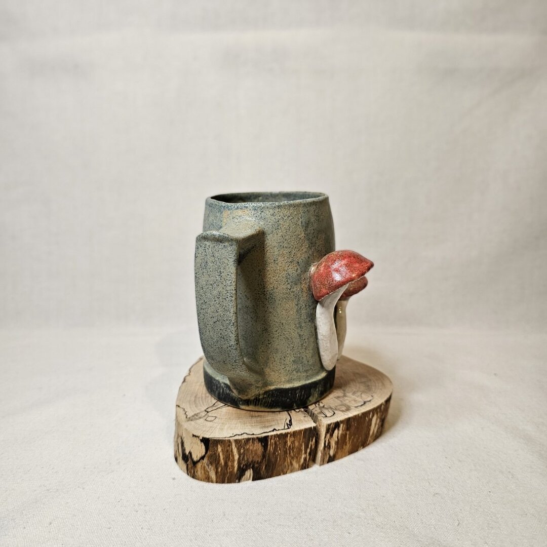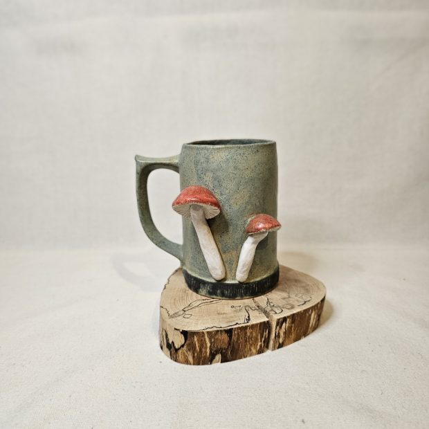 Ręcznie wykonany kufel ceramiczny z pracowni Diada, ozdobiony przestrzennymi muchomorami. Dwa ręcznie modelowane grzybki tworzą wyjątkową, niemal rzeźbiarską dekorację, która przyciąga wzrok i nadaje naczyniu niezwykły, leśny charakter.
