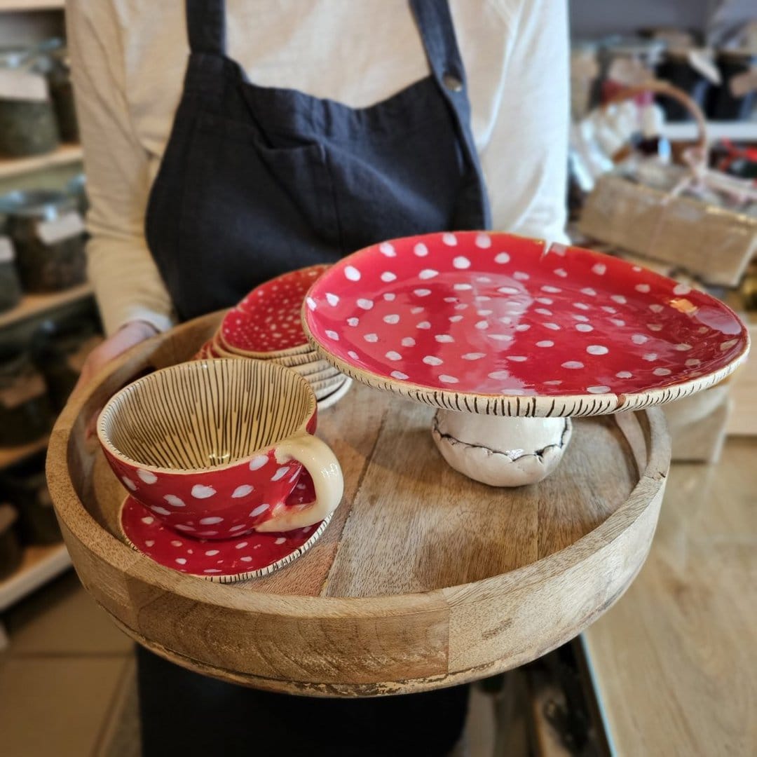 Ręcznie wykonana patera z pracowni Taraka, która wygląda jak mały muchomor wyrastający na stole. Czerwony kapelusz w białe kropki i ceramiczna nóżka tworzą formę, obok której trudno przejść obojętnie.