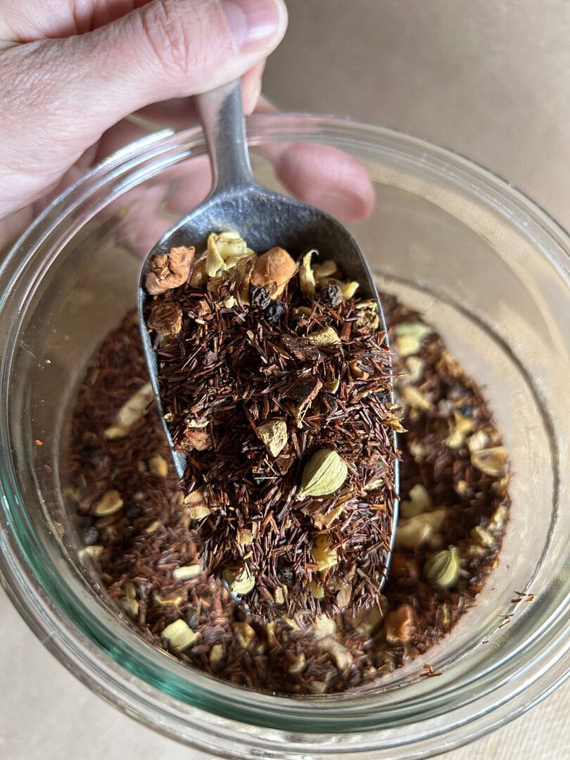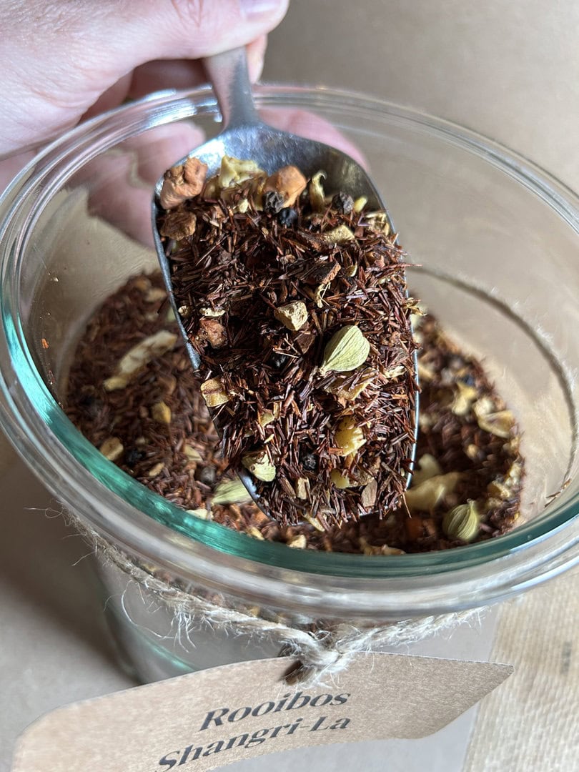 Rooibos Shangri La to wyjątkowa mieszanka, która łączy w sobie bogactwo rooibosa, pikantność imbiru, ciepłą nutę cynamonu, słodycz jabłka, delikatność płatków kokosa oraz nuty kardamonu, czarnego pieprzu i migdałów. Spróbuj tej niezwykłej herbaty i poczuj, jak smaki przenoszą Cię w magiczne zakątki Shangri La.