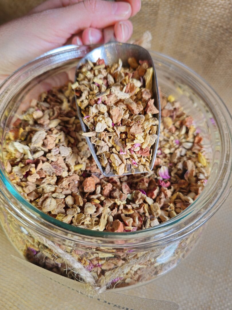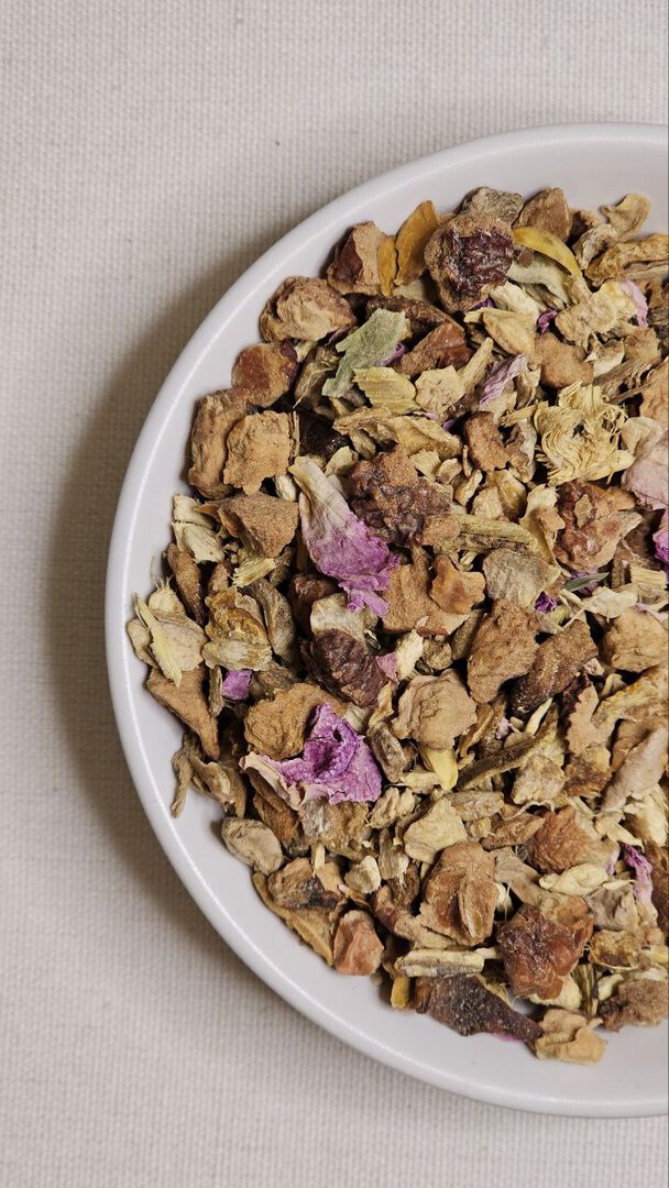 Poznaj harmonijną kompozycję pełną ciepła i naturalnej energii! Aż 50% imbiru sprawia, że ten napar doskonale rozgrzewa i pobudza, a towarzyszące mu soczyste jabłko i skórka cytrynowa dodają delikatnej słodyczy i cytrusowej świeżości. Korzeń lukrecji subtelnie balansuje smaki, nadając im lekkiej aksamitności, a płatki róży dopełniają całość eleganckim, kwiatowym akcentem.