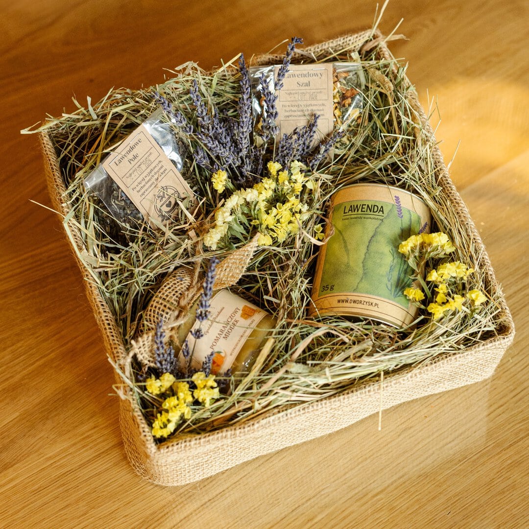 Zestaw zapakowany w naturalne siano z dodatkiem suszonych kwiatów – gotowy do wręczenia albo… na moment tylko dla siebie 💛