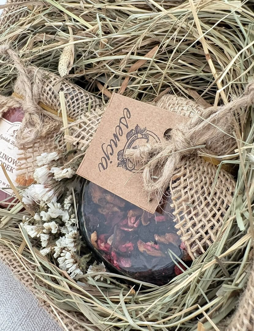 Zestaw zapakowany został w eleganckie pudełko ozdobne. Jego wnętrze wyłożono naturalnym siankiem, a całość udekorowano suszonymi kwiatami. Dzięki temu zyskał wyjątkowy, rustykalny charakter, który zachwyca zarówno wyglądem, jak i atmosferą, jaką wprowadza.