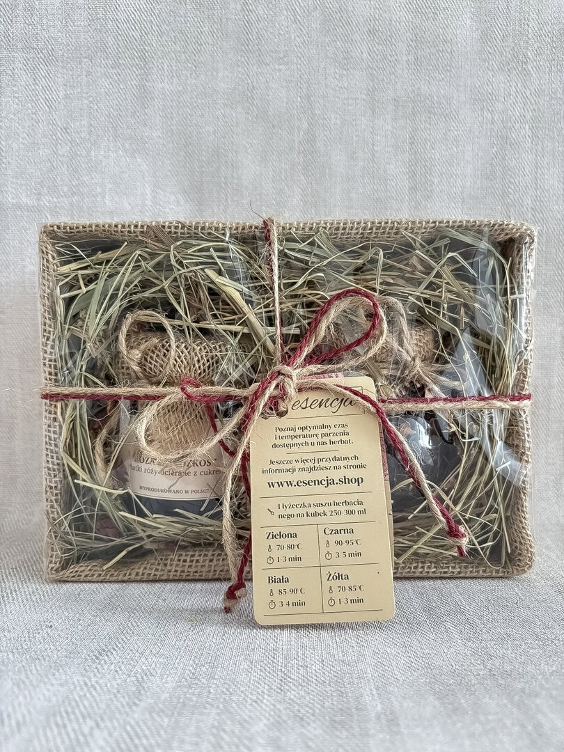 🎀 Piękne i naturalne – zestaw zapakowany w dekoracyjne pudełko, wyłożone naturalnym siankiem, przewiązane sznurkiem jutowym i ozdobione suszonymi płatkami kwiatów.