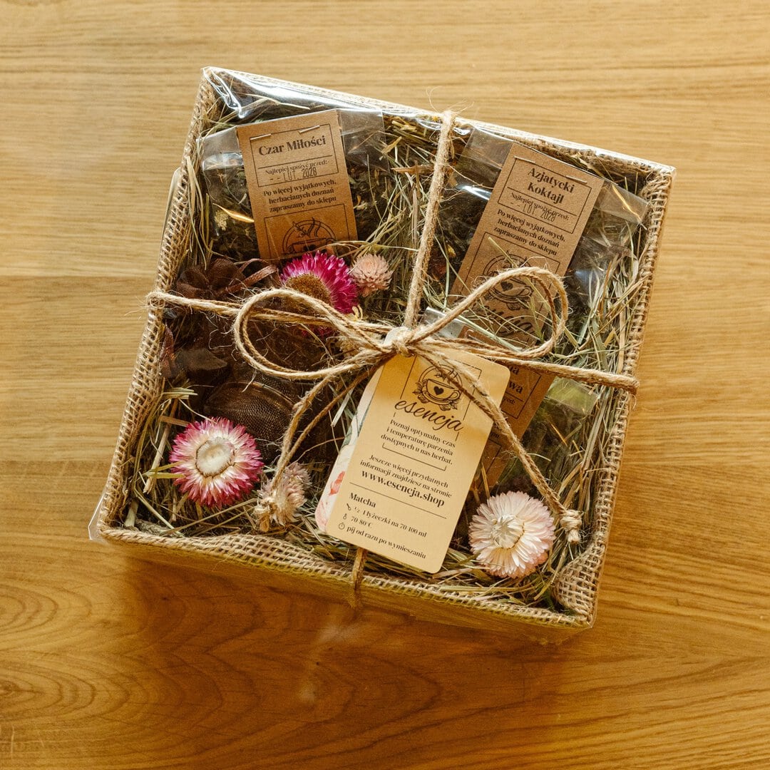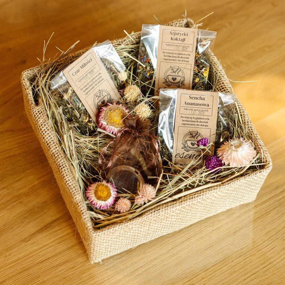 Każdy zestaw przygotowujemy ręcznie, dlatego może się delikatnie różnić – układ herbat, dodatki czy dekoracje.