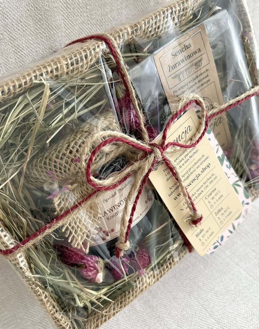 Zestaw umieszczony jest w eleganckim, kompaktowym pudełku, ozdobionym naturalnymi dodatkami i przewiązanym jutowym sznurkiem. Dzięki temu wygląda estetycznie i gotowy jest do wręczenia – bez potrzeby dodatkowego pakowania.